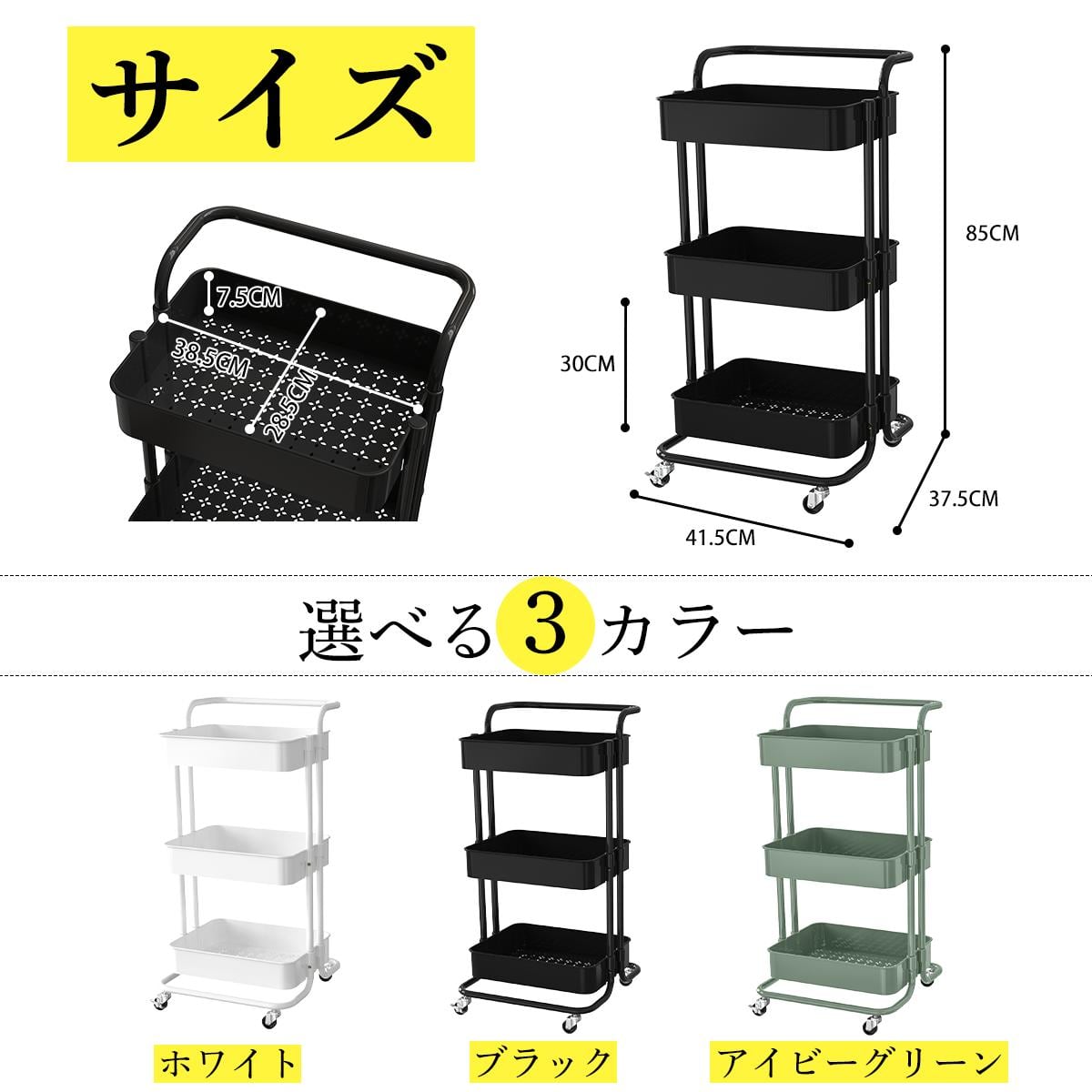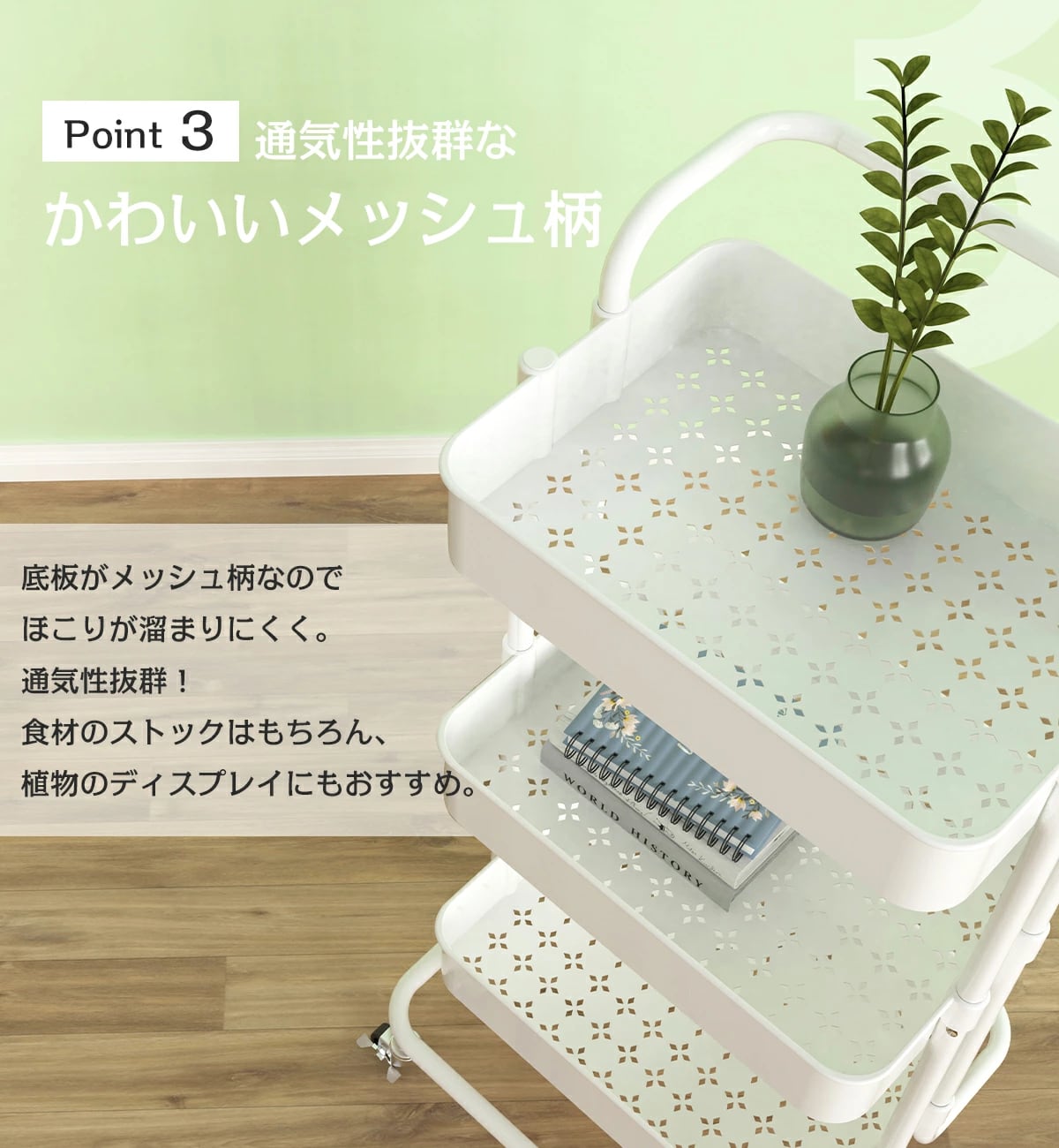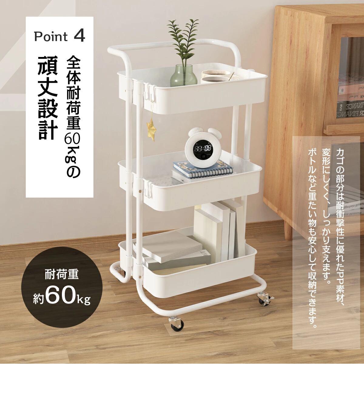 キッチンに華を添える、取っ手付きのキッチンワゴンです!耐荷重60㎏のこのワゴンは、3段の収納スペースを備え、食材や調理器具を効率良く収納できます。これにより、キッチンがすっきりと片付き、調理作業がより快適に進められます。